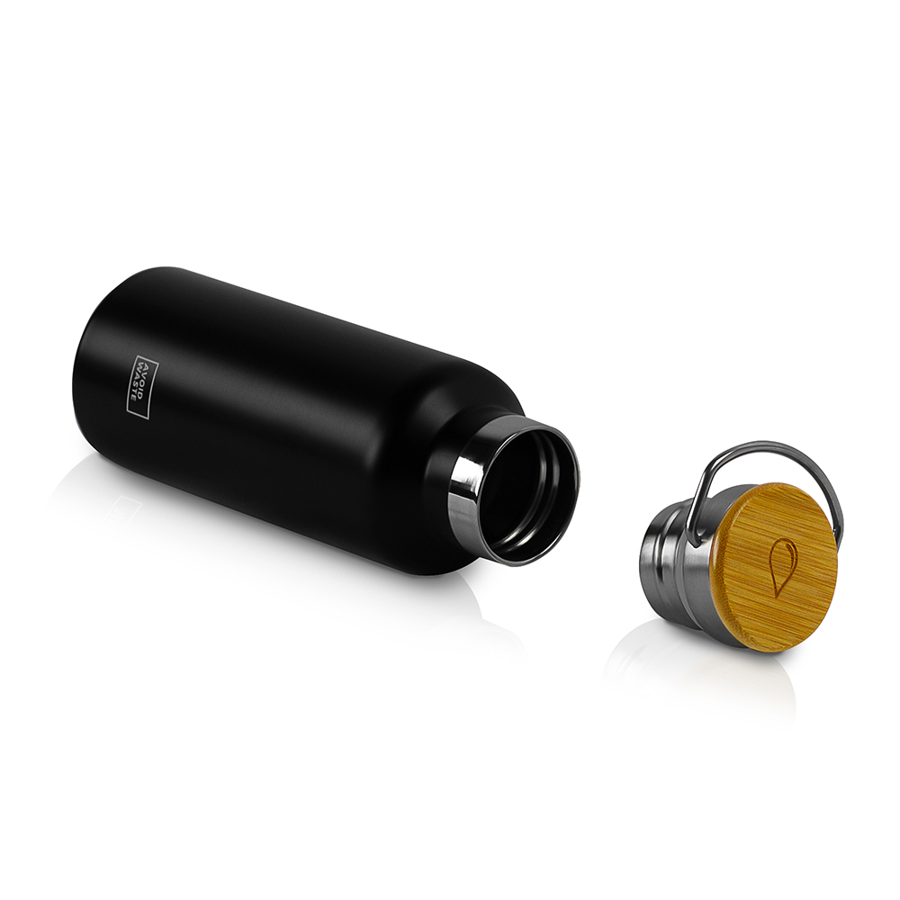 Nie wieder lauwarmer Eistee oder eiskalter Winterpunsch – mit unserer nachhaltigen Thermosflasche aus hochwertigem Edelstahl bist du bestens ausgestattet! Das edle schwarze Design in Kombination mit dem Deckel aus Bambus ist ein echter Hingucker. Ein dünner Silikonring sorgt dafür, dass die Flasche auslaufsicher ist. Sogar bei Getränken Kohlensäure! Durch die Isolierung bleiben deine Getränke bis zu 12 Stunden heiß (oder kalt), perfekt für Leitungswasser an heißen Tagen und Tee oder Kaffee zum Aufwärmen im Winter.